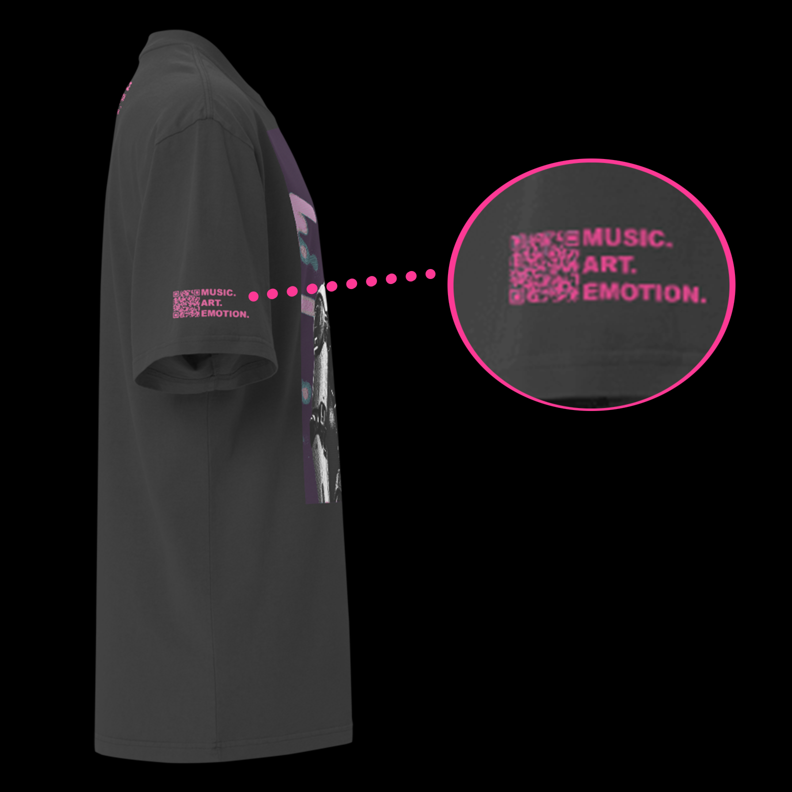 A CUSTOM QR CODE IS PRINTED ON THE RIGHT SLEEVE. WHEN SCANNED, IT UNLOCKS ACCESS TO THE TRACK “SENTIENT” BLENDING FASHION WITH MUSIC.
